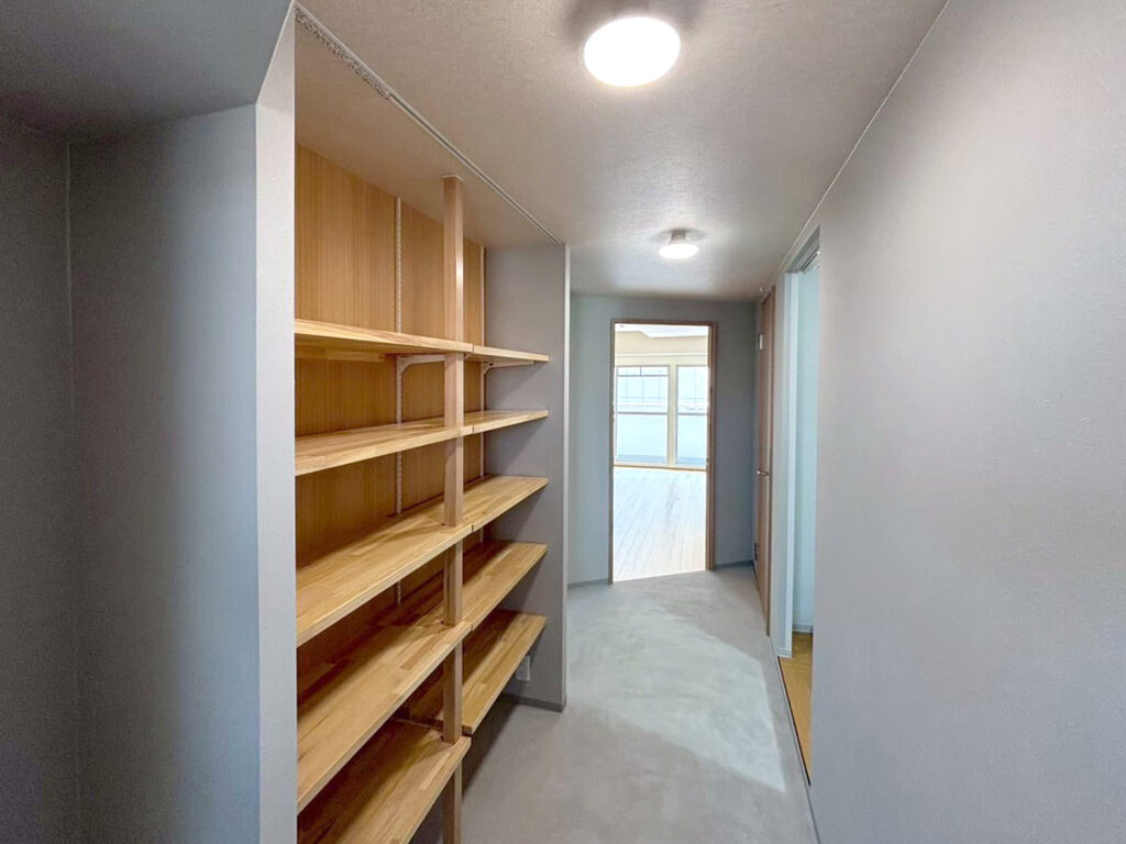 廊下収納の上部には埋込式カーテンレールを設けているので、カーテンをつければ生活感もすっきり。