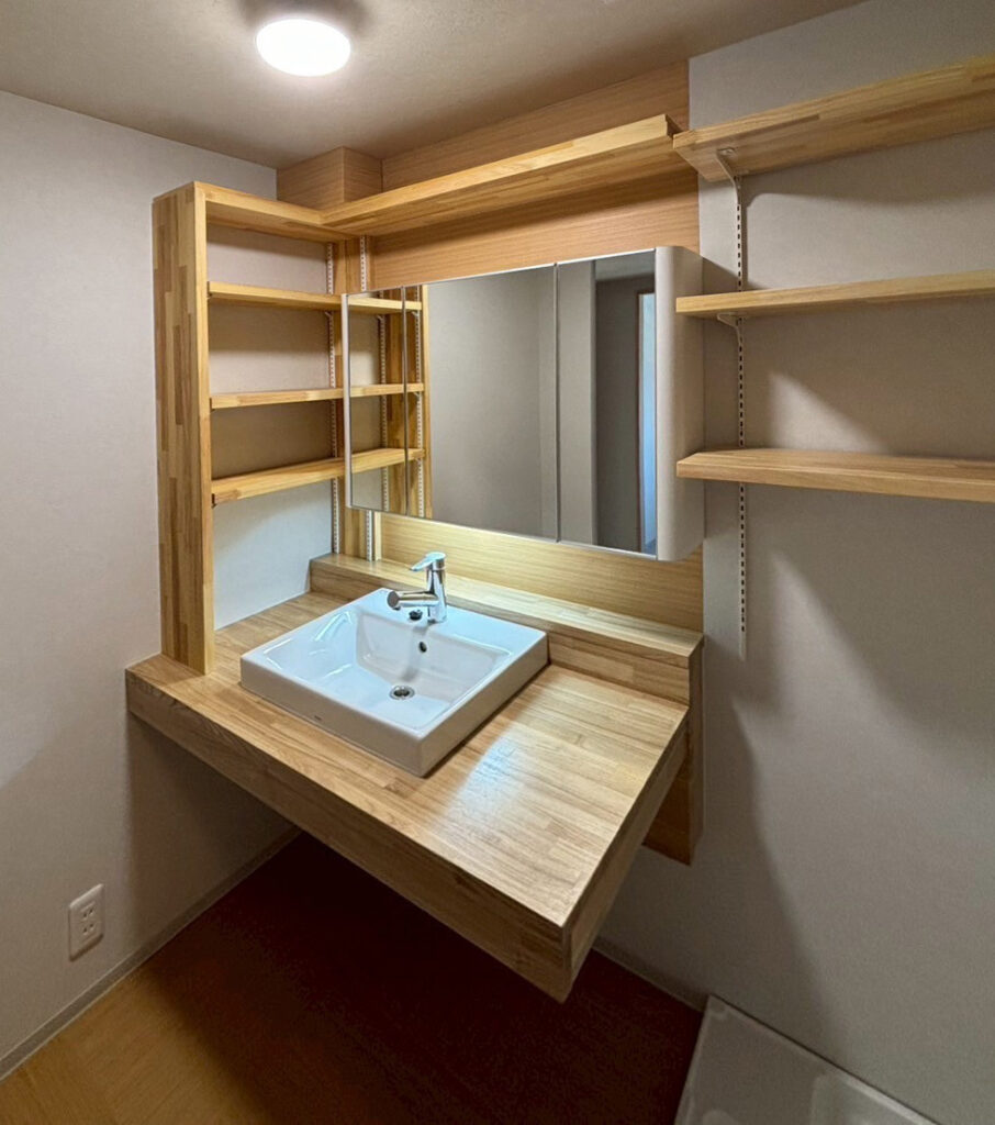 シンプルな造作洗面台に、木の棚をたっぷりと。