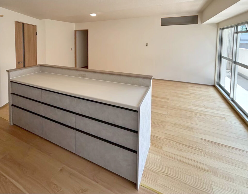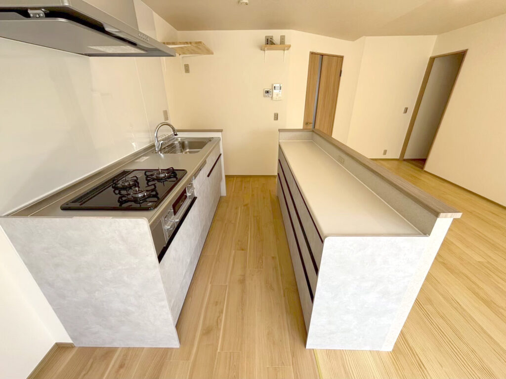 キッチンの対面には造作カウンターを設置し、空間のつながりと使い勝手を両立。