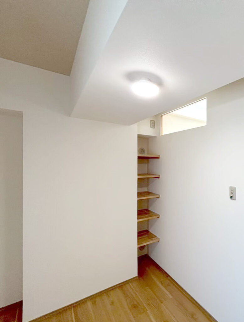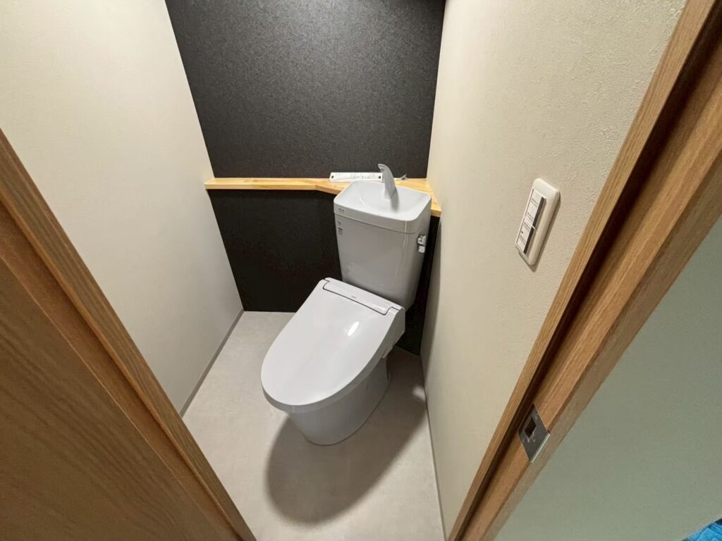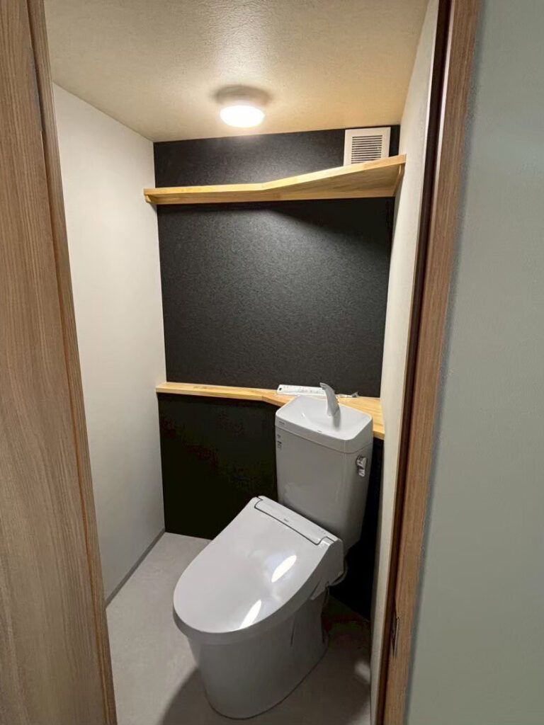 変形間取りのトイレには木の棚を設置し、コンパクトながら収納力も確保しました。