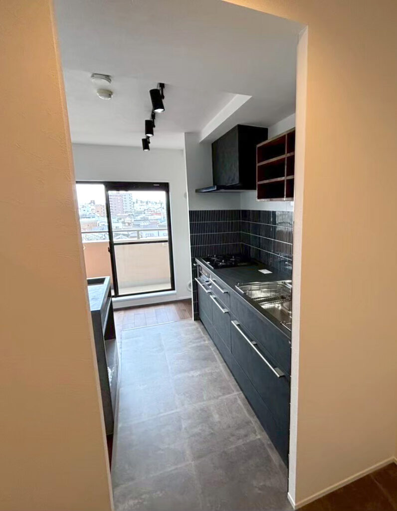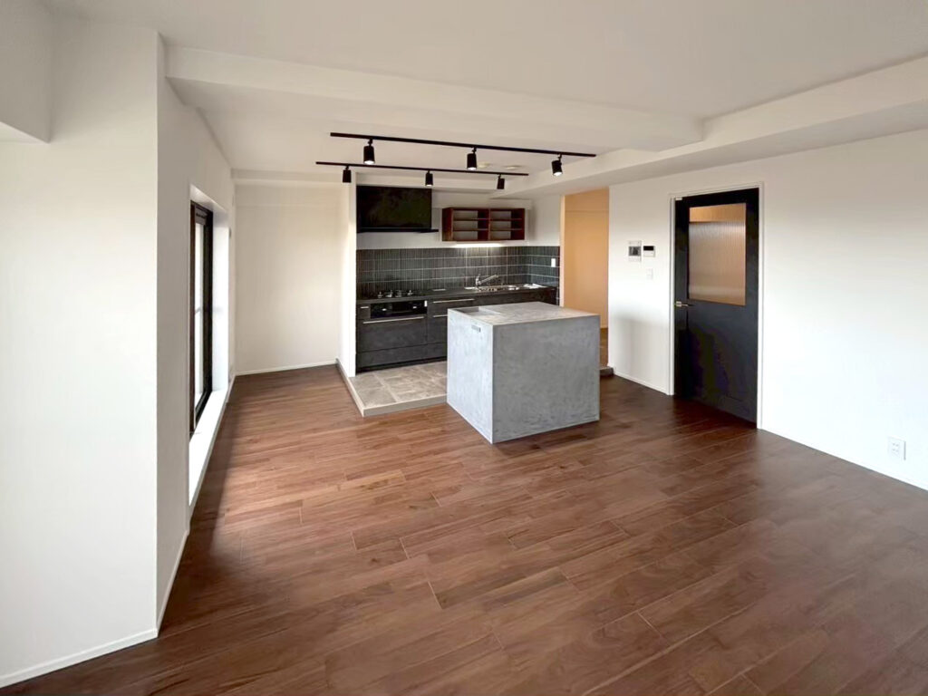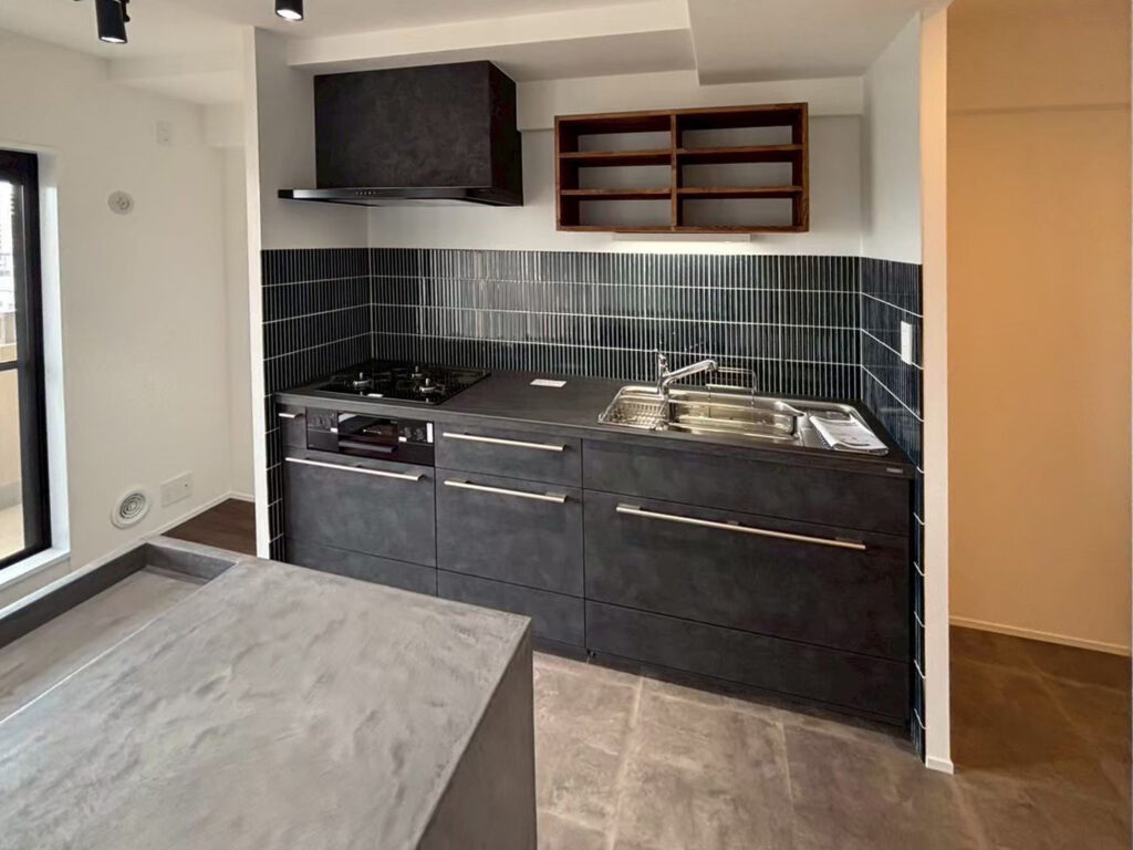 ダークグレーのキッチンや黒い建具が存在感を放つ、落ち着いた空間。